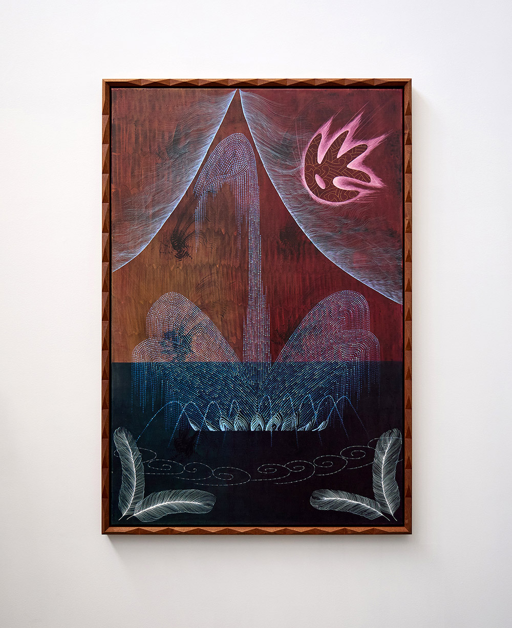 Townsend describes her work: “Water is the binding thread throughout the series — the awa, the wishing well, Rotokawau Virginia Lake, the Higginbottom Fountain. The surfaces shimmer with iridescence, inspired by my nana’s diamond paintings, in which tiny mosaic-like resin stones are intricately arranged on a canvas. A similar treatment, achieved through acrylic paint, transforms a palm tree, a bridge, and other common Whanganui motifs into glistening water features capable of holding memory and replenishing it. Lines and letters recall my dad’s hand as a sign-writer — precise and direct. Embellishment, in all its forms, reveals itself as whakapapa, a family vernacular for mythology-making.”